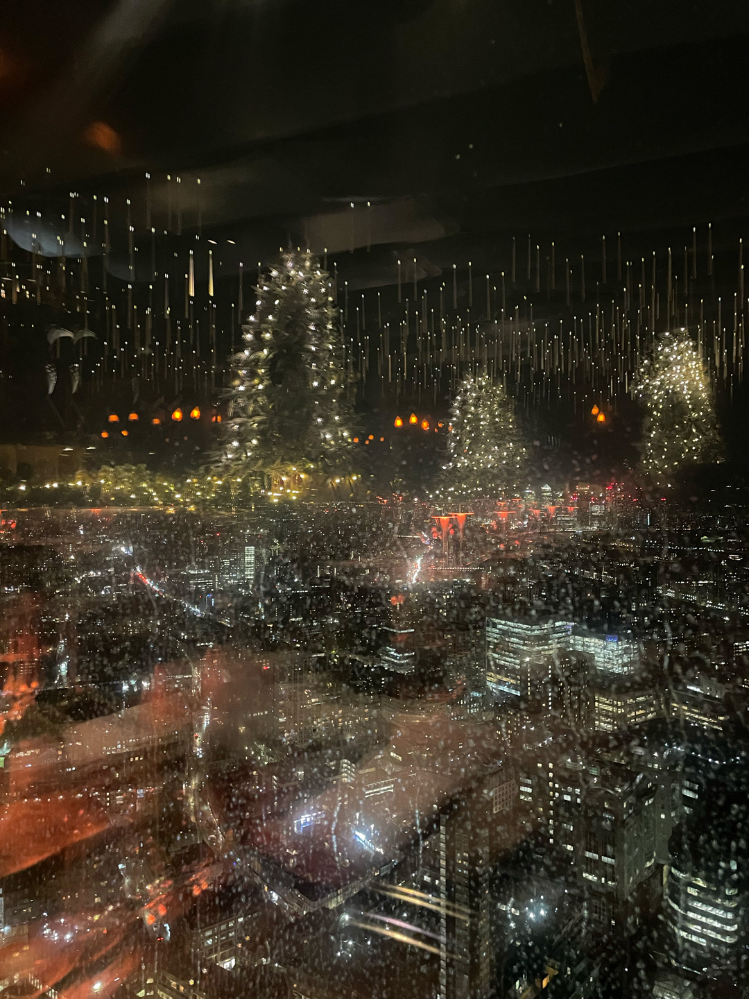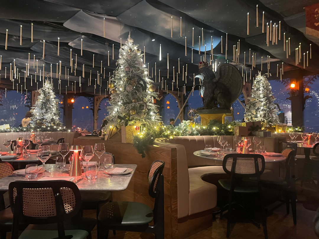 Duck & Waffle, perched on the 40th floor of 110 Bishopsgate, is one of those London spots where the journey up is almost as memorable as the meal itself (our ears popped with the speed of the lift). Even on what turned out to be one of the wettest days of the year, the vast expanse of windows created a dramatic atmosphere, with the city blurred beneath sheets of rain. Inside, the festive Christmas decorations added warmth and sparkle, creating a cosy contrast to the storm outside. The open kitchen provided an energetic backdrop, while the lounge bar (with an open central bar) buzzed with chatter.