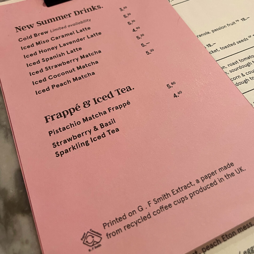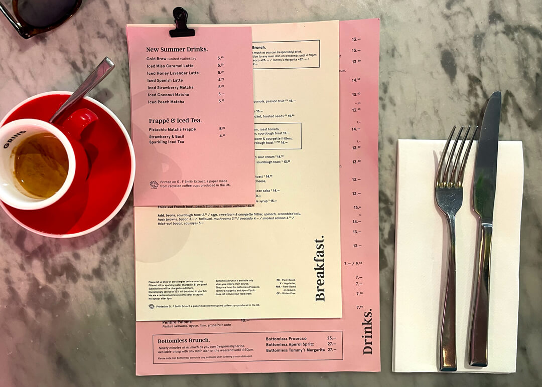 We visited Grind, Broadgate Circle, located just steps from Liverpool Street Station, which offers a stylish setting with both indoor and outdoor seating. The coffee menu is comprehensive, featuring a wide range of options, from classic flat whites to beetroot and turmeric lattes. The brunch menu is good, featuring dishes such as the full English, sweet potato cakes, and other fresh, flavorful options that are well-presented. That said, portions can feel a little on the smaller side for the price. We tried the classic smashed avocado and poached eggs on sourdough. Menus are nicely presented with stepped page sizes neatly clipped with a black clip.