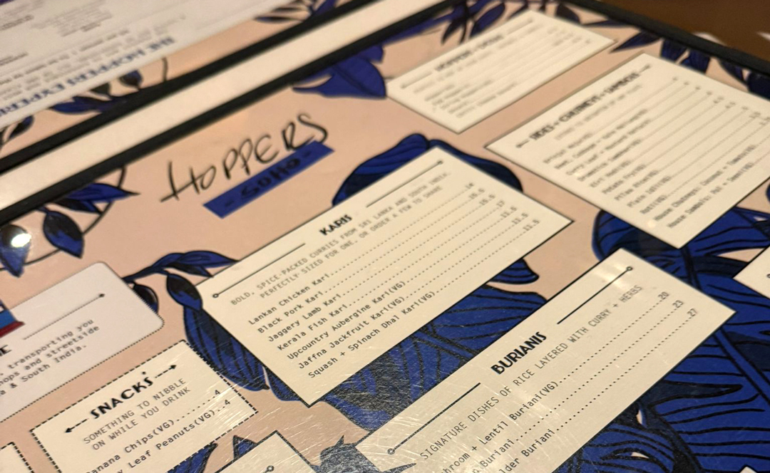 Hoppers Soho (there are two other locations in London) delivers a fun and immersive brand experience that takes guests straight to the heart of Sri Lanka and South India. From entering the restaurant, its design is complemented by vintage travel posters and Tamil script, setting the tone for a cultural and culinary journey. The compact restaurant evokes the business of a street-side eatery, strengthening Hoppers’ brand identity as an authentic dining destination.