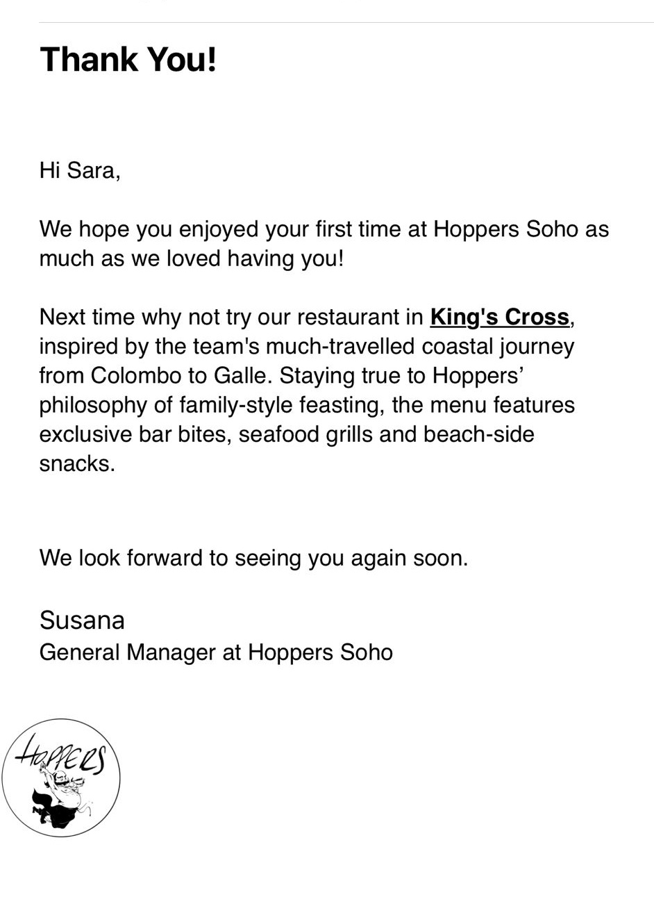 From the Tamil movie song playlist to the use of traditional serving ware (neatly marked with the brand) contributed to a coherent brand narrative rooted in heritage. Hoppers is stylish and authentic. We shared a mix of small plates, which gave a better chance to sample more dishes. Even after the visit, the connection continues; we received a follow-up email (automated but warmly written) expressing gratitude and suggesting a visit to another location. It’s part of a three-restaurant group, so this subtle nudge both promotes the brand and extends the sense of hospitality beyond a single visit. The result is a memorable, multi-sensory experience that encourages repeat visits and word-of-mouth recommendations.