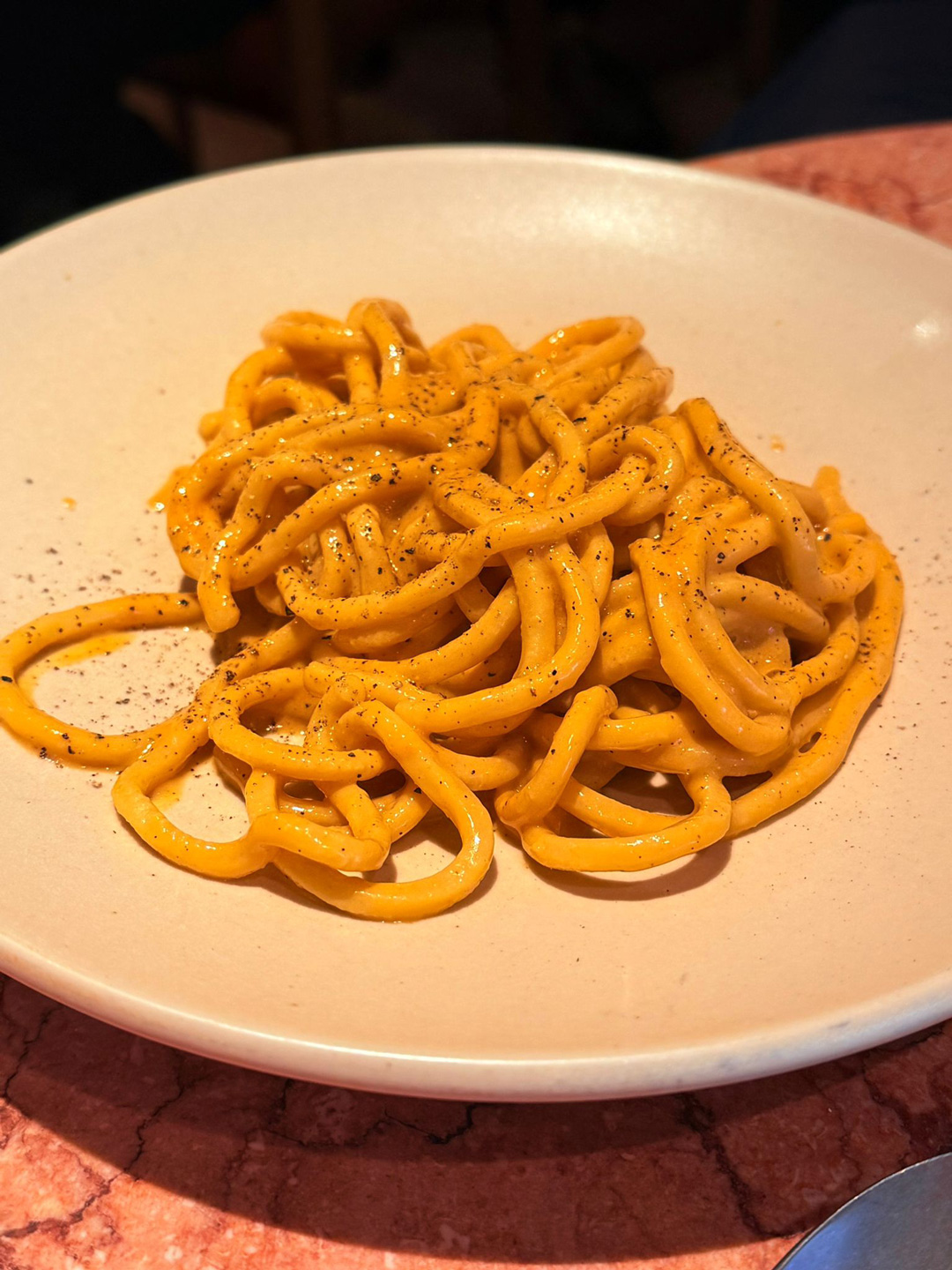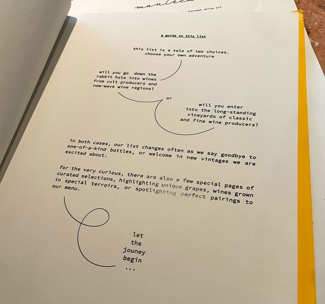 The menu itself was refreshingly simple, with typed ingredients and no unnecessary waffle. It was clear, focused and easy to navigate, which we appreciated. The wine list, on the other hand, told a different story. It felt like a chance to “go down the rabbit hole” and explore off-the-main-road offerings and thoughtful pairings if you wanted to. The linework linking back to the logo was a nice touch visually. We loved the “rapid rigatoni” character, albeit slightly at odds with the styling of the pig motif; it felt playful and clever, drawing in the speedy lunchtime crowd with the promise of something tasty at a reasonable price for the area.