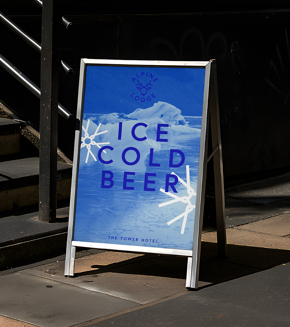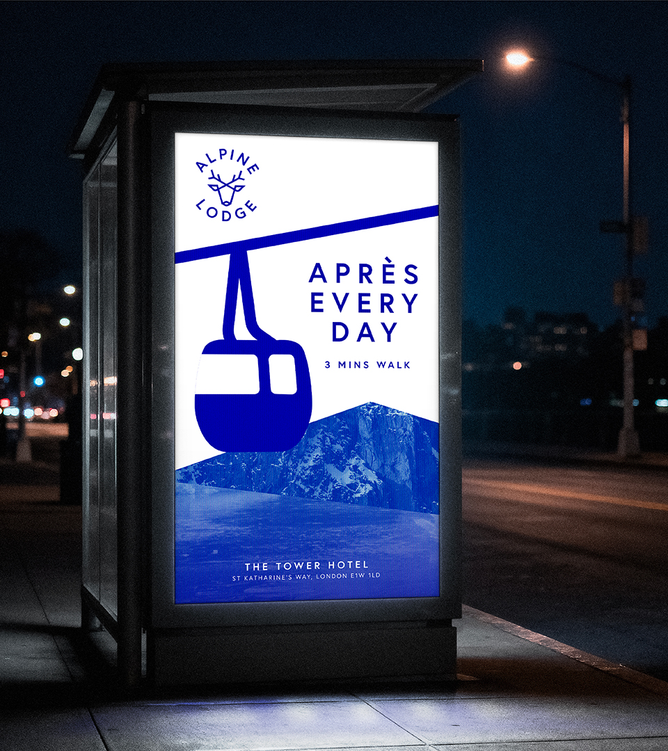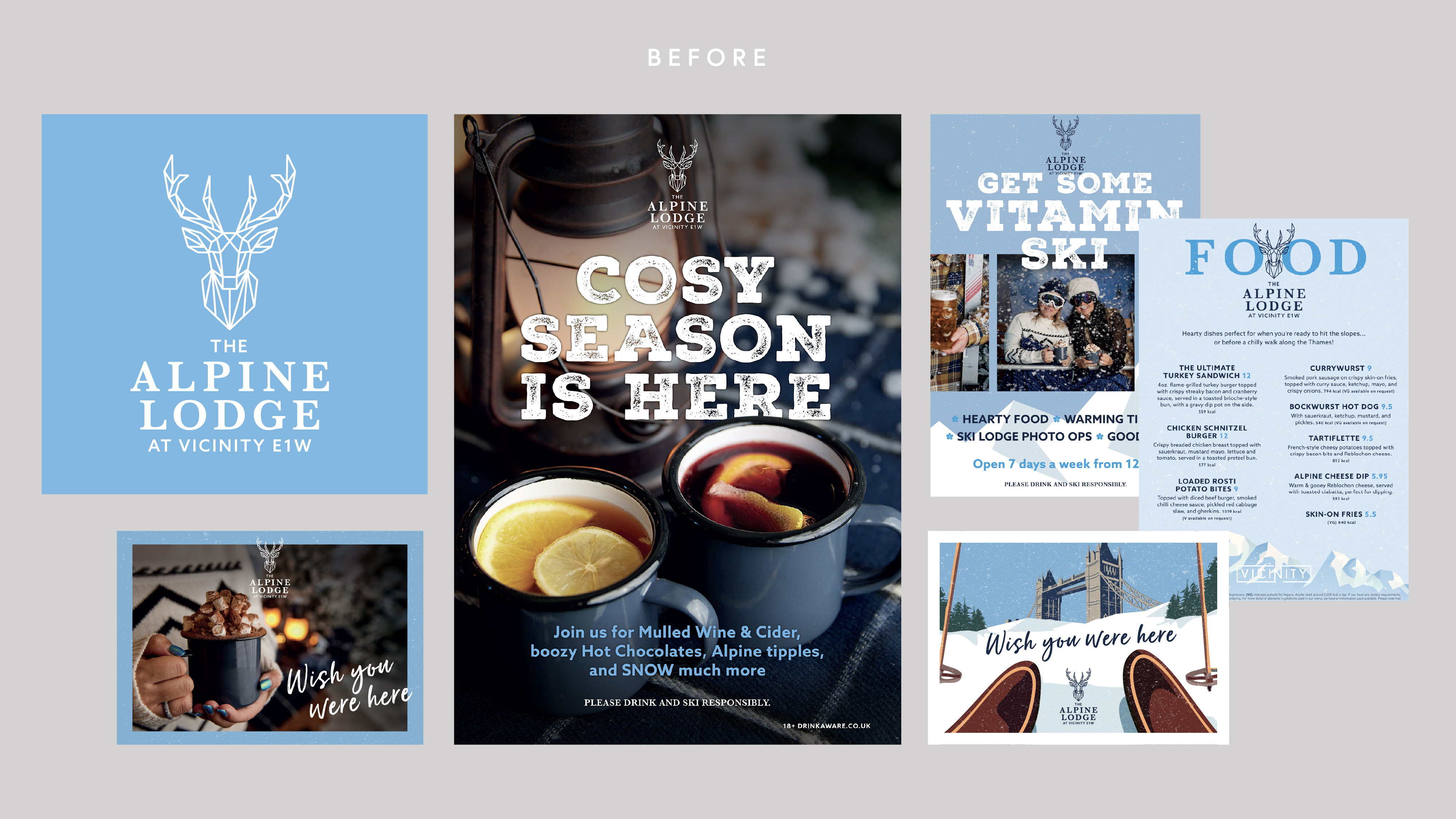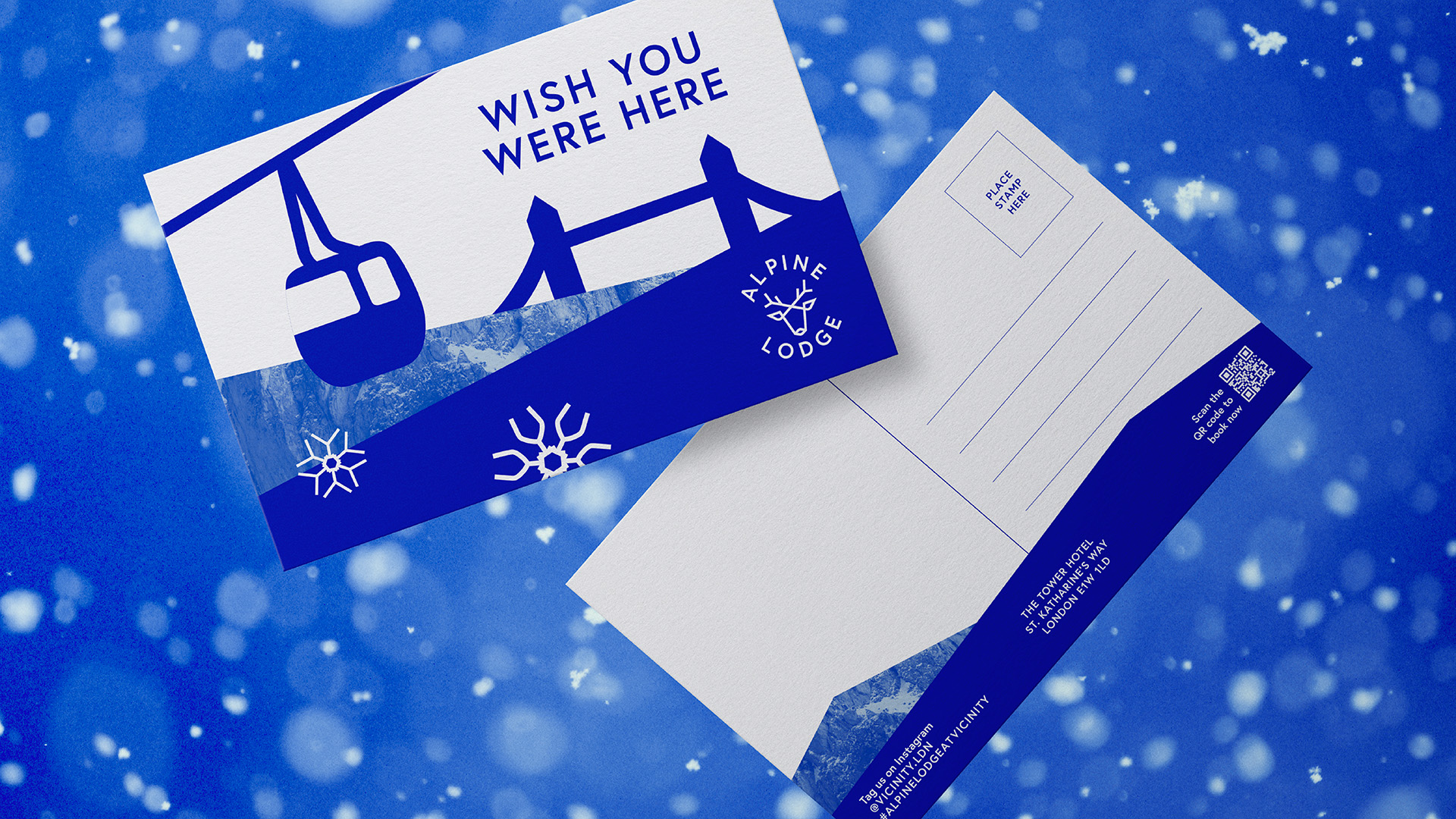 The Alpine Lodge needed a refreshed visual identity that could elevate a seasonal pop-up concept into something distinctive and contemporary without losing its connection to the parent Vicinity brand. The team had to develop a system that felt modern yet capable of expressing both the warmth of an alpine lodge and the crispness of winter. Achieving this required a strong visual anchor and a design system that could scale seamlessly across print, digital and environmental applications.
