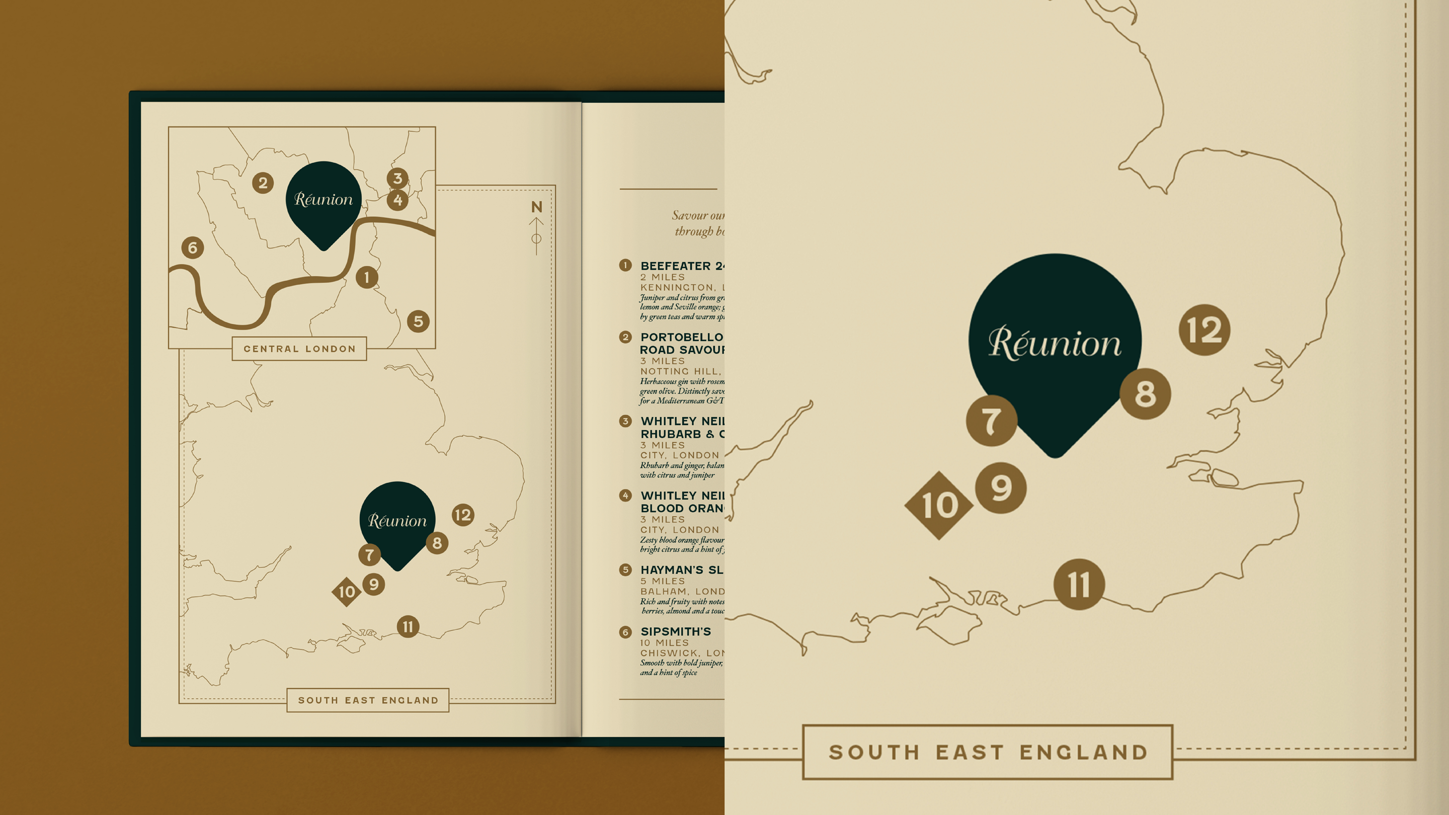 - Menu & storytelling: harmonising heritage with innovation through drinks descriptions, illustrated gin map and accessible yet playful language inspired by train journeys.