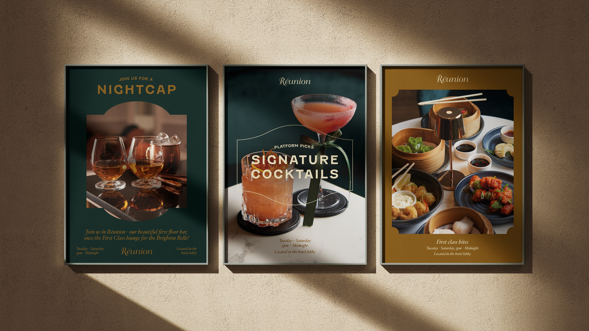 We refined the Réunion Bar logotype, removing unnecessary detail to achieve an elegant clarity. A new visual identity was crafted around the theme of train travel and heritage: